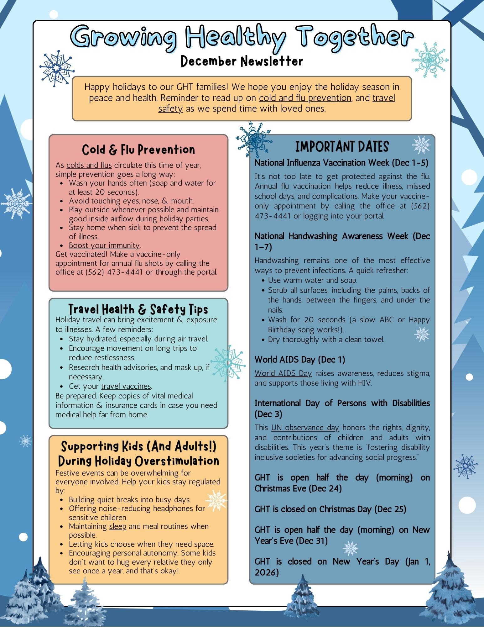 Happy holidays to our GHT families! We hope you enjoy the holiday season in peace and health. Reminder to read up on cold and flu