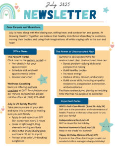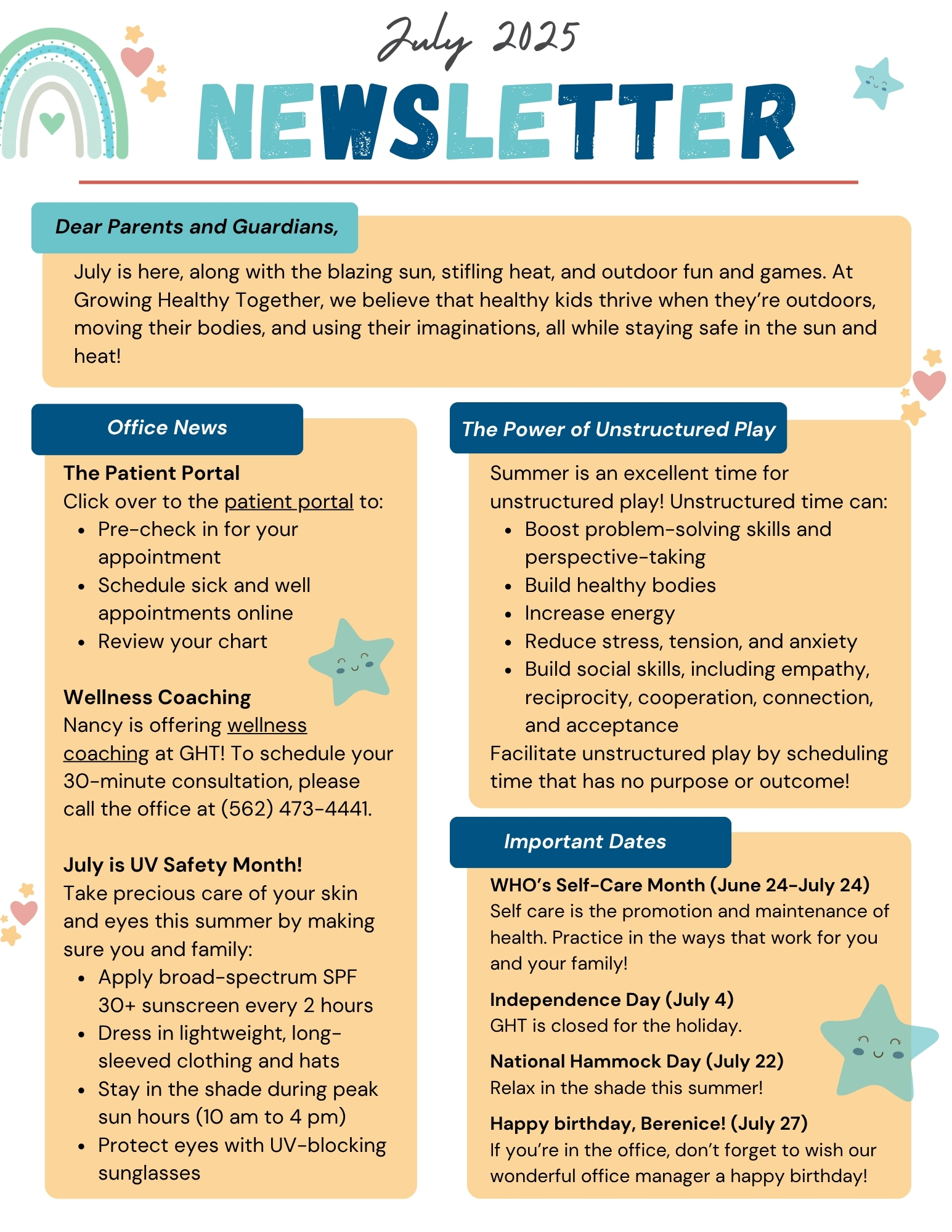 We’re here to help your family grow happy and healthy this summer and always. As always, you can reach us on the Spruce app or by calling the office at (562) 473-4441. Check out your patient portal for making appointments.