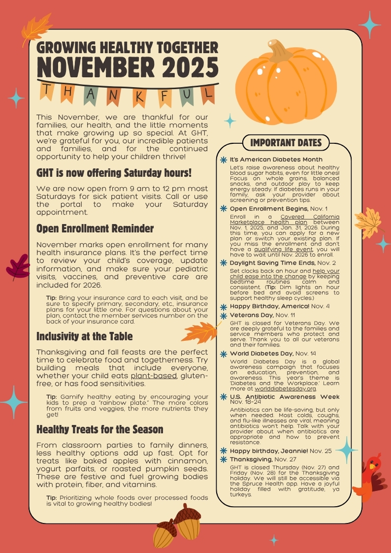 stylized infographic with same information as the postNovember is a month of gratitude. This November, we are thankful for our families, our health, and the little moments that make growing up so special. At Growing Healthy Together, we’re grateful for you, our incredible patients and families, and for the continued opportunity to help your children thrive!